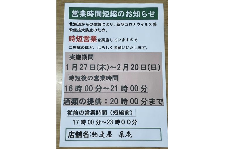 1/27(木)~2/20(日)の間、まん延防止等重点措置の為、営業時間の変更となります。 営業開始:16時
